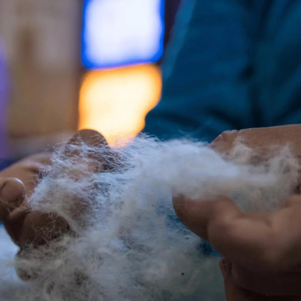 De la tonte à la fibre, chaque étape du travail de la laine est effectuée à la main avec un respect total de la nature.